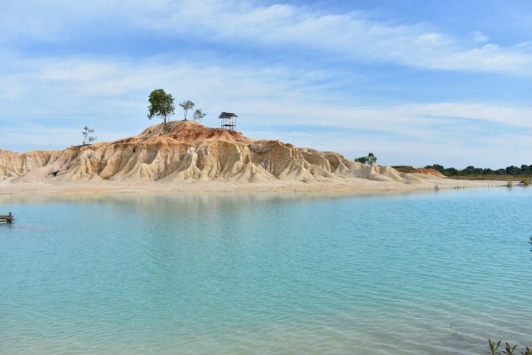 Bekas area penambangan yang kini menjadi padang pasir putih dengan bukit-bukit kecil yang estetik. Di sebelahnya terdapat danau dengan air berwarna biru pekat yang kontras dengan pasirnya.